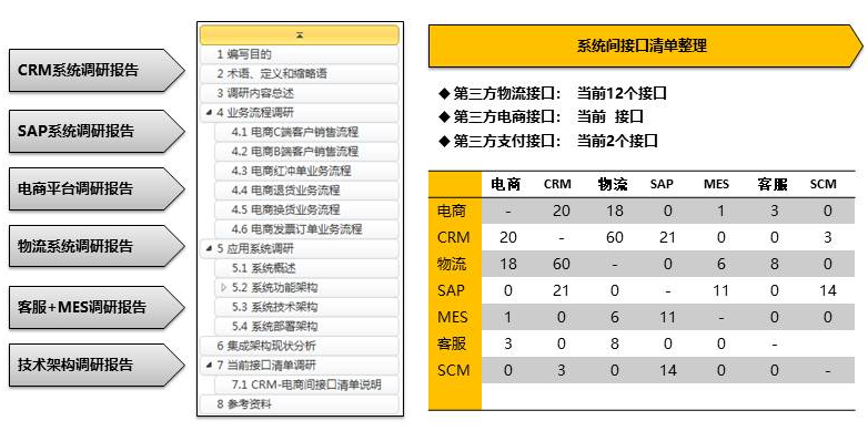 业务调研完成后应该输出完整的业务流程调研报告,其中也包括了对业务系统间交互接口的调研和现状梳理。