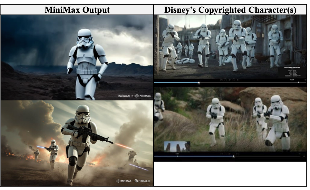 原告方还在起诉文件中大量举证,比如在“海螺AI”中输入相关文字,“海螺AI”就可基于大量未经授权的版权作品生成可供下载的高质量图像和视频,这其中就包含了迪士尼旗下的星球大战、华纳旗下的神奇女侠和环球旗下的小黄人等著名IP。