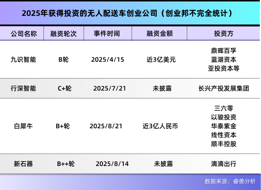 目前,九识智能已完成了3轮融资,2025年获得近3亿美元B轮投资,投资方包括亚投资本、鼎晖百孚、蓝湖资本、BV百度风投等。