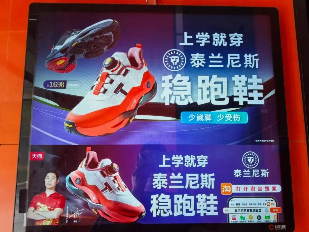 创始人丁飞凭借对市场的敏锐洞察,逐步从区域品牌发展成全国性高端童鞋标杆。真正的转折点发生在2022年。泰兰尼斯与分众传媒合作,启动饱和式广告投放,覆盖全国100多座城市的电梯媒体,以及北上广等数十个城市的机场和高铁站。2023年,泰兰尼斯进一步扩大投放,在广州市、上海市、成都市等城市曝光1亿线下客群。
