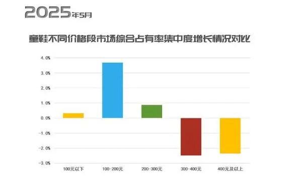 另一个挑战来自于消费者理性回归。儿童脚部发育速度快,一双鞋往往穿三五个月就不合脚,花七八百元购买,在多数家庭看来并不划算。《2025年5月童鞋品牌销售分析》报告显示,今年5月份,监测范围内的童鞋商品零售平均价格与去年相比有所下降。平均价格在300元以下的品牌市场综合占有率与去年相比有所增长,300元以上的品牌市场综合占有率与去年相比下降明显。