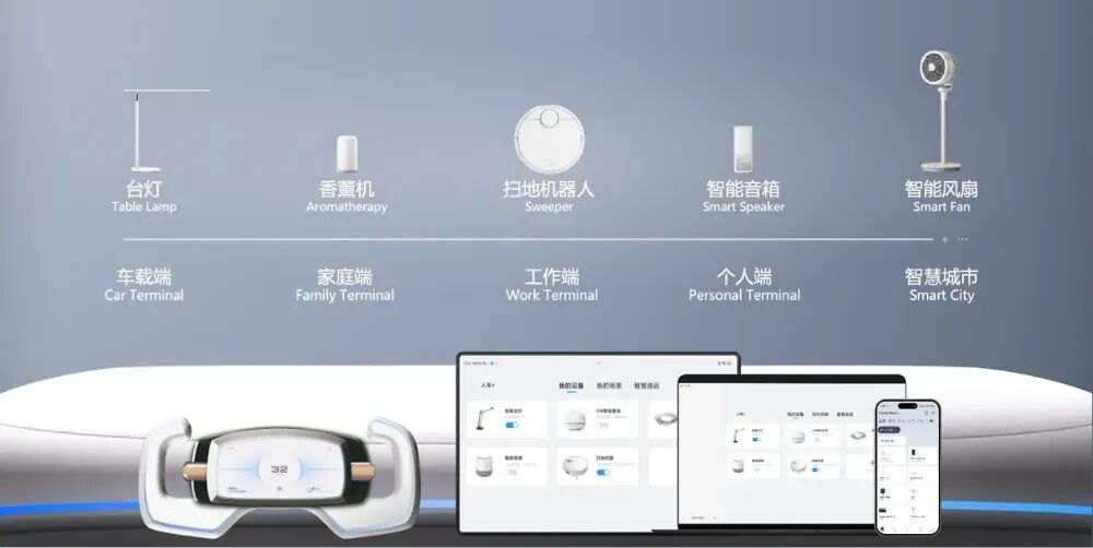与传统车机关注汽车内部不同,润芯微的智能座舱实现了车与外界环境的智能连接。座舱既可以连接手机,还可以像扫地机器人、香薰机等家庭端或工作端的智能设备,实现“人车家”跨场景、跨设备的智能化体验。