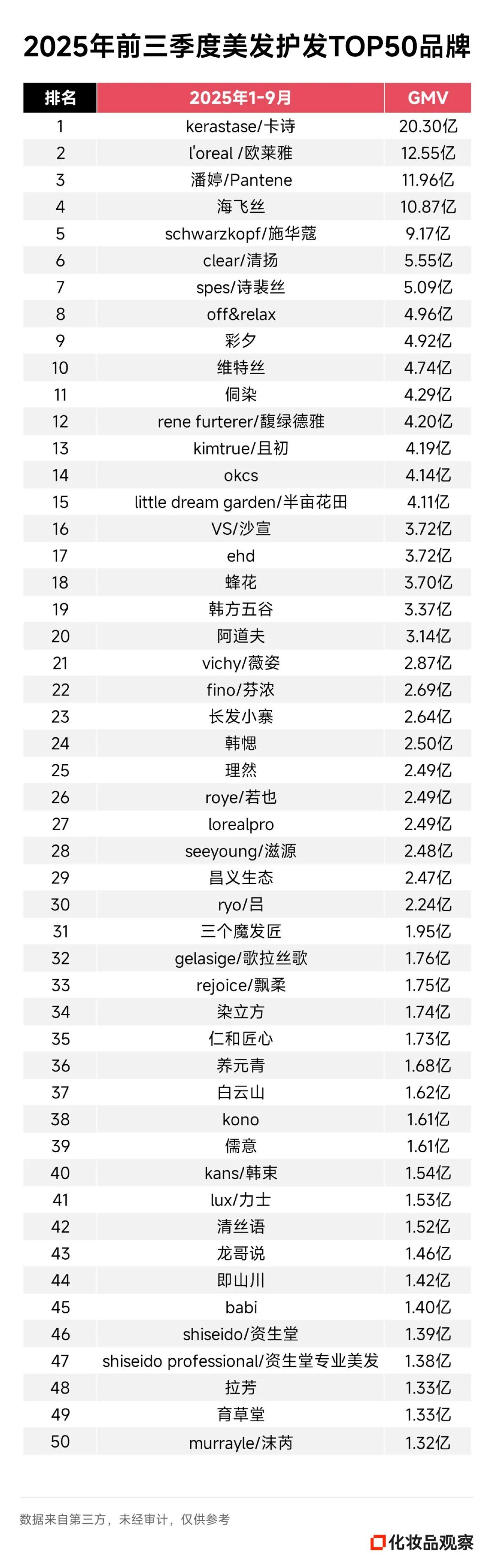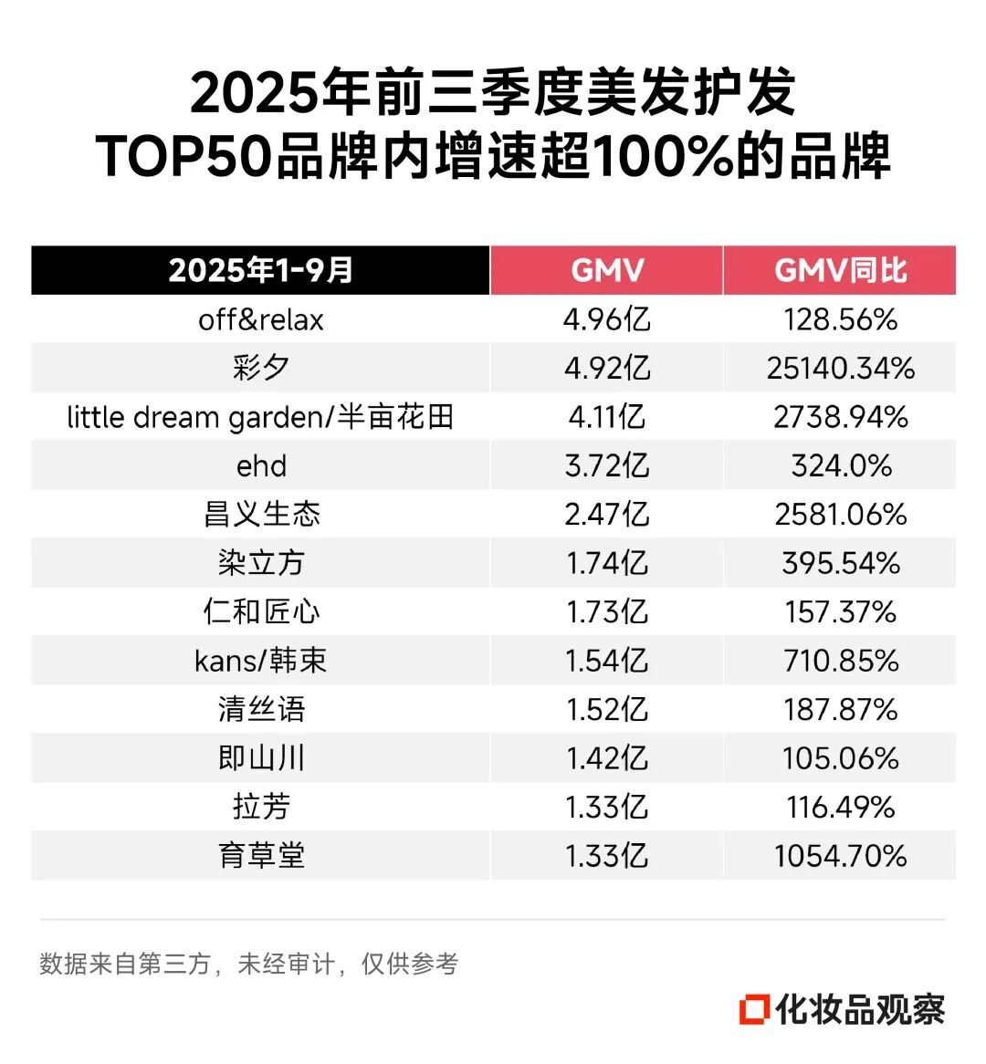 TOP50品牌: 半亩花田/韩束/EHD增速领跑洗发水 染发类彩夕/侗染/Okcs跻身美发护发TOP20