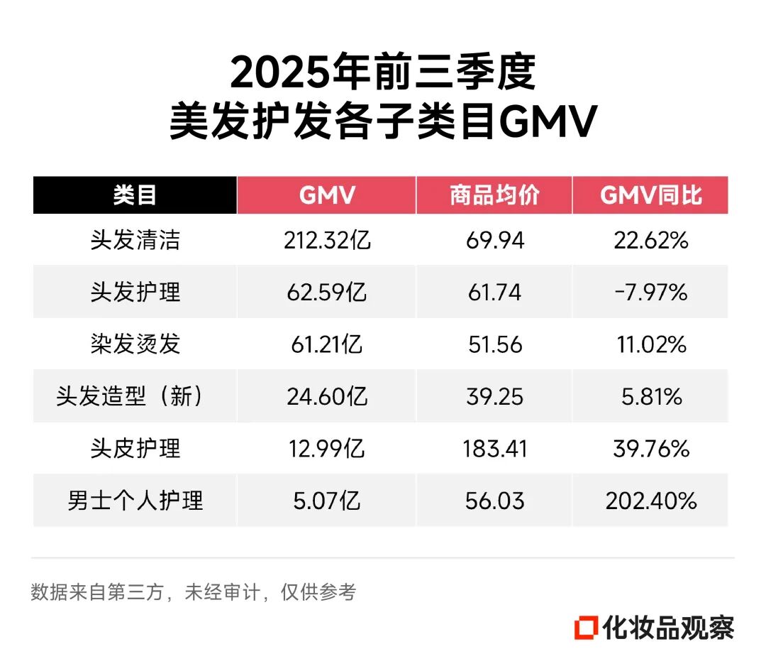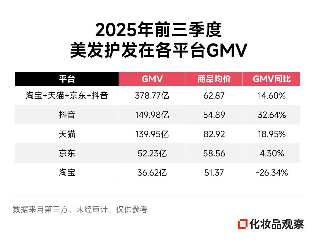 根据第三方数据,今年前三季度,主流电商平台美发护发品类GMV达378.77亿元,同比增长14.6%。其中,抖音的增速达30%以上,天猫的增速也将近20%。