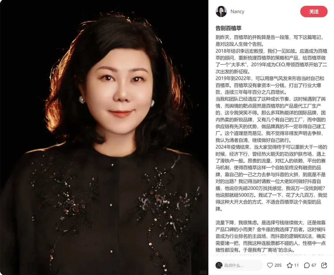 原百植萃品牌联合创始人兼CEO孙晖(Nancy)也提到了她选择告别百植萃时的深度思考:“昂贵的流量,对红人的依赖,平台的赛马机制,使得百植萃这样一个自始至终没有融资的品牌,靠自己的一己之力去参与抖音的火拼,到底是不是对的出路?我记得当时请教一位大佬如何做好抖音自播,他说你先砸2000万找找感觉,我说万一没找到呢?他说那就砸5000万。”