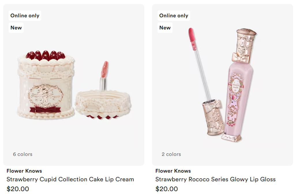 据ULTA官网显示,此次花知晓上架的产品包括2025年新品贝壳珍珠、草莓丘比特等系列。其定价与海外官网同价,草莓丘比特系列蛋糕唇霜显示售价为20美元(约合人民币141元)。