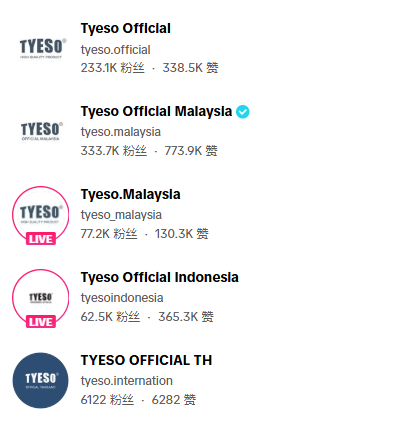 Tyeso品牌部分账号 图源:TikTok
