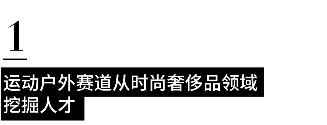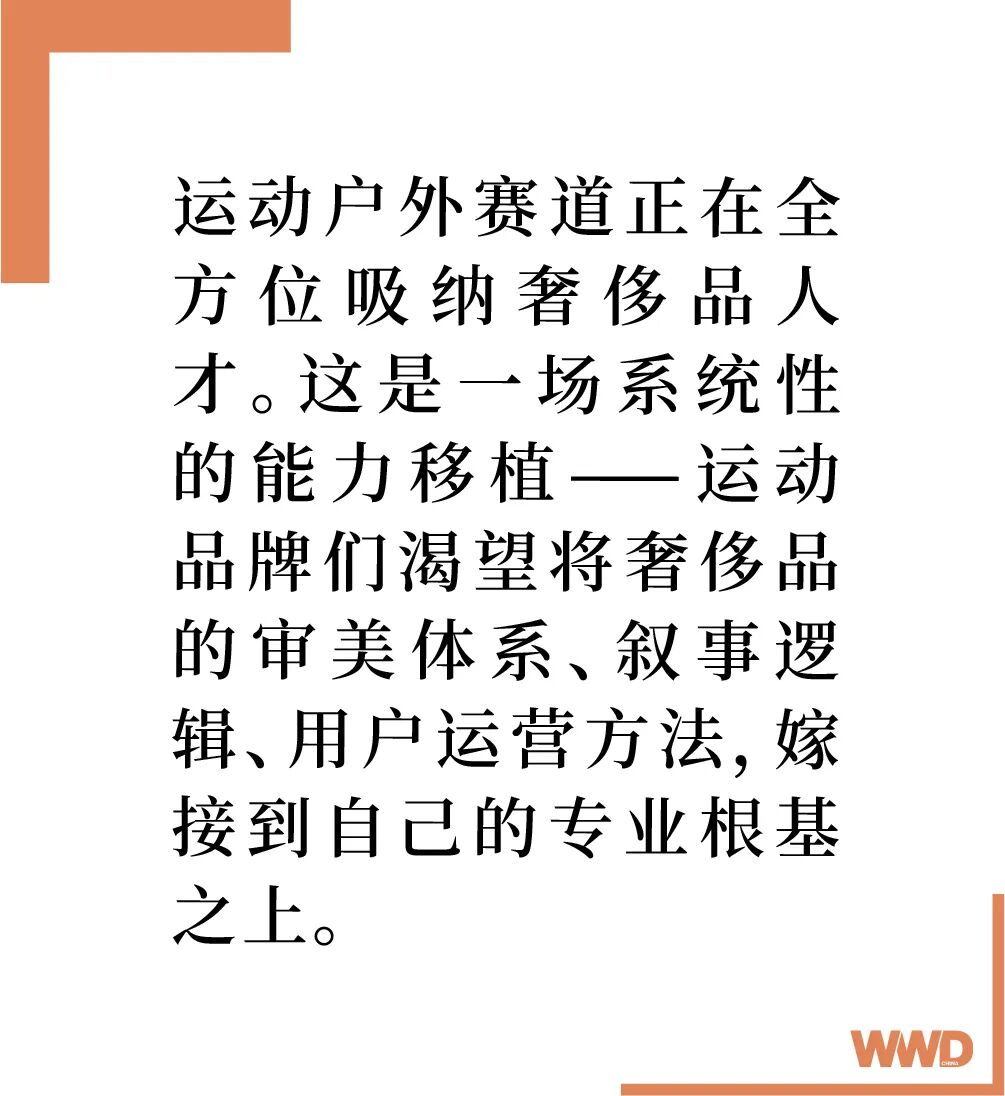 从产品设计到市场营销,从国际巨头到本土品牌,运动户外赛道正在全方位吸纳奢侈品人才。这是一场系统性的能力移植——运动品牌们渴望将奢侈品的审美体系、叙事逻辑、用户运营方法,嫁接到自己的专业根基之上。