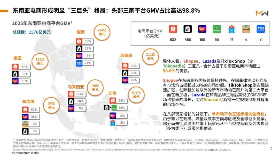 根据墨腾上周发布的《东南亚电商市场报告2026》的最新GMV估算数据,在2025年,三家平台占到了东南亚电商平台GMV的98.8%。