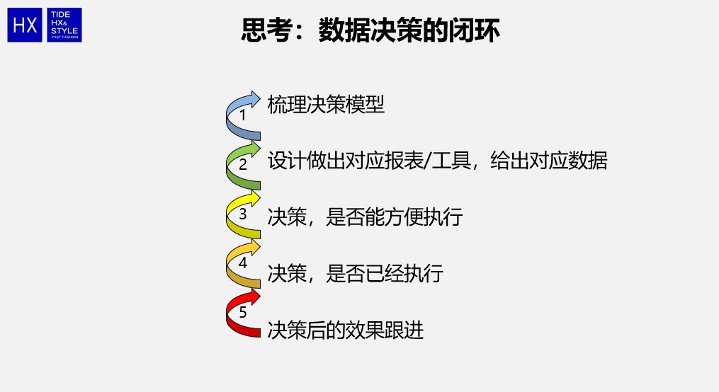 讲到流程闭环,提几个关键点,第一个是关于数据价值的应用,基础数据肯定是最核心的,不管BI还是其他,首先是先搞定公司内部数据,至少把公司内部数据的标准、指标的维度等全部梳理清楚,再去考虑对外的大数据,如果内部数据还没用好,考虑太多也没太大意义,如果做得不错,客流的收集、智慧门店等都可以慢慢推进。然后基础数据和数据仓库基础的指标做好,有了这个基础,就要更深入的基于场景来解决问题,每个决策一定是基于场景,一个报表解决一个问题,或者说一个工具解决一个问题,这是我的建议和看法,比如说,做了一张报表出来,放一堆乱七八糟的东西,到底能解决什么,如果不能帮我们做决策,我觉得是没用的,也是没有意义的。经常有人讲智能商品决策,什么叫智能决策?我觉得是通过计算机或者通过程序能快速计算,在海量的数据里快速发现价值帮助我们做决策,这在以前人为操作是很难的,不管是计算量的问题,或者时间问题。但目前在鞋服这个传统行业,人工智能学习还是可以先放在后一步,现在先把决策逻辑和模型梳理出来,人为调整和确定,这是一种思路和方法,当然每次的指标系统还是可以给出比较好的建议和优化的。