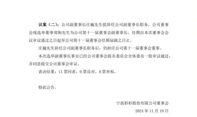 同时,公告指出,郑驹在辞任董事长后,将接替庄巍担任公司副董事长职务,而庄巍辞去公司副董事长职务后,仍将担任公司第十一届董事会董事。