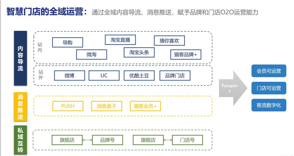 那我们智慧门店的全域运营是哪一些呢?因为本来在阿里这块过来大家都是做生意的,人家都是奔着交易的目的去进行。追寻和兴趣投放了包括搜索的那。这边通过三种消息,可以通过内容的导流。通过导购微淘淘宝值淘宝头条,包括猫科品牌,淘宝直播,或者是猜你喜欢。