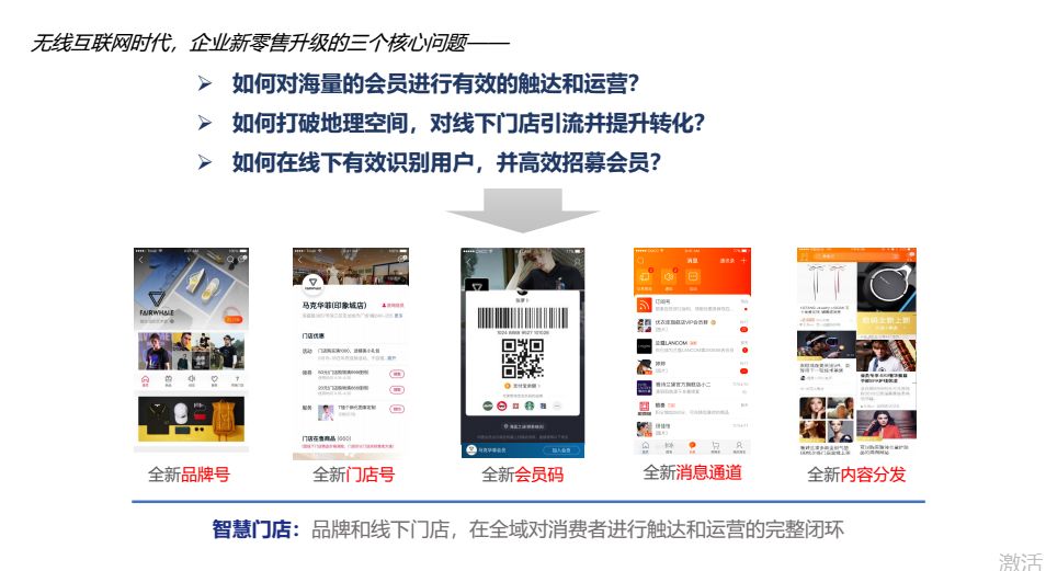 其实在无线互联网的时代,企业升级的三个核心问题是什么。我总结有三点,第一点的是。如何对海亮的会员进行有效的触达和运营?如何打破这个地理的空间,对我们的线下引流并且转化?怎么样识别线下有效的客户,并且高效的招募会员?那这边呢,智慧门店提出了一些观点,这些观点都是围绕啊,你如何去做全新的品牌号,全新的门店号,全新的会员,全新的沟通消息通道,包括全新的内容触达。