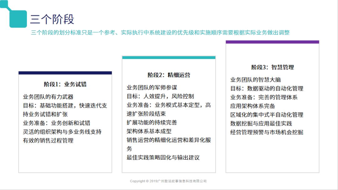 这个阶段CRM的建设重点:基本功能模块基本搭建完毕,架构体系初步成型,加强精细化运营管理以及风险控制方面的建设,针对业务流程,通过系统将管理过程标准化,规范化,数据化;针对营销工作,通过进一步的客户细分与营销策略设计,实现具备业务价值的自动营销策略与任务推送策略,协助销售部门识别机会、问题、风险,对各个生命周期阶段的客户提供差异化的刺激、唤醒策略,对不同贡献度的客户实现差异化的服务、跟进策略。